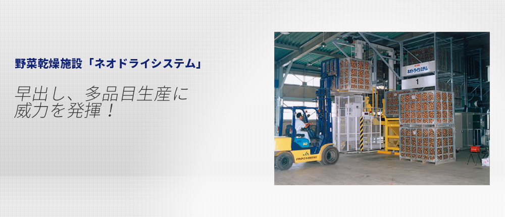 野菜乾燥施設「ネオドライシステム」 早出し、多品目生産に威力を発揮! 概要 ネオドライはエアバック方式を採用した除湿、冷却、加温(熱交換式)で仕上げる野菜用乾燥施設です。 ムラ乾燥、腐敗防止で品質アップ スピード仕上げで早出し出荷OK 多品目乾燥が可能 低コスト施設 簡単操作でラクラク安全運転 パース図 部品供給終了機種一覧